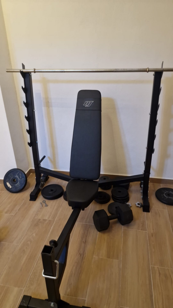 Set MS41_2.0_83KG_G | Panca regolabile con supporti e inclinazione negativa + modulo preacher + pressa per gambe + stazione pulldown + barre rinforzate e pesi gommati 83 kg - Marbo Sport